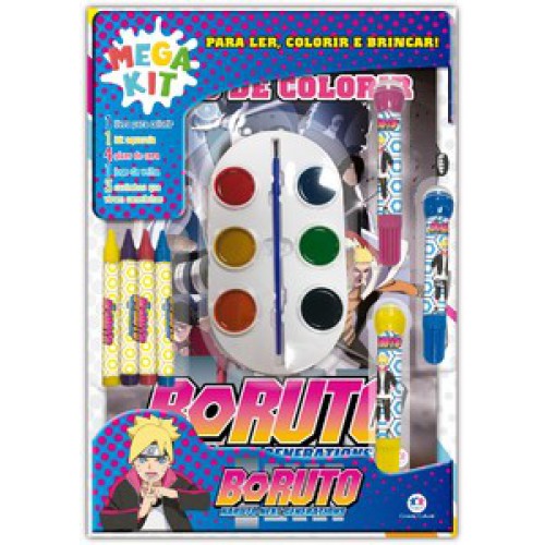 Prepare-se para muita diversão na companhia de Boruto e sua turma. Neste megakit ninja, há um livro dos personagens para colorir, gizes de cera, aquarelas, canetinhas com carimbos, além de um jogo para recortar e brincar! Contém: 1 - Livro, 3 - Canetinhas com Carimbo, 4 - Gizes de cera, 1 - Estojo com 6 aquarelas. Como usar as aquarelas? Passo 1: Molhe o pincel com um pouco de água. Passo 2: Passe o pincel na tinta da cor escolhida. Passo3: Passe o pincel na página para ver as cores em aquarela.