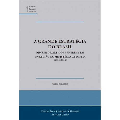 A grande estratégia do Brasil reúne textos da gestão do Embaixador Celso Amorim no Ministério da Defesa, de agosto de 2011 a dezembro de 2014. Os discursos, artigos e entrevistas aqui reproduzidos são perpassados pela ideia de que, no Brasil, política externa e política de defesa devem se coadunar em uma grande estratégia de defesa do interesse nacional e de promoção da paz. Essa é a linha-mestra da abordagem de todos os grandes temas da Defesa Nacional no período, como a modernização das Forças Armadas, o fortalecimento da indústria nacional de defesa, a capacitação tecnológica nacional, a cooperação de defesa com os parceiros da América do Sul e do Atlântico Sul, a contribuição do país como provedor de paz às Nações Unidas e o papel dos militares em uma sociedade democrática. A Grande Estratégia do Brasil é uma coedição da Fundação Alexandre de Gusmão e da editora Unesp, com apoio do instituto Pandiá Calógeras.