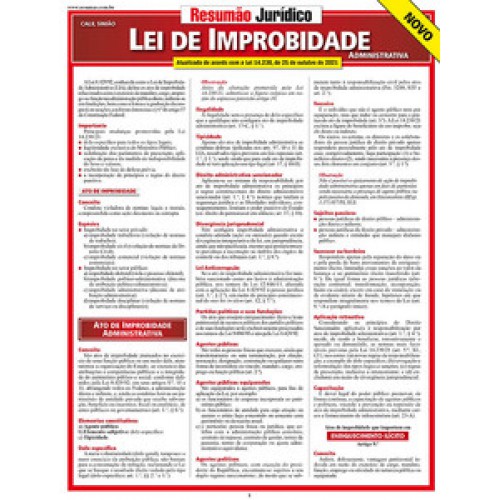 Este Resumão traz as principais informações, os conceitos e as explicações sobre a Lei 8.429/92, a Lei de Improbidade Administrativa - já com as novidades trazidas pela Lei 14.230/21. Quais foram as principais alterações definidas pela lei promulgada no final de outubro? Qual o conceito de dolo específico? Ação de improbidade administrativa, competência, sentença, sanções e aplicação das penas. Este Resumão explica os conceitos básicos da improbidade administrativa e facilita a compreensão desta matéria que é objeto de vários concursos públicos.z as principais informações,Este Resumão traz as principais informações, os conceitos e as explicações sobre a Lei 8.429/92, a Lei de Improbidade Administrativa - já com as novidades trazidas pela Lei 14.230/21. Quais foram as principais alterações definidas pela lei promulgada no final de outubro? Qual o conceito de dolo específico? Ação de improbidade administrativa, competência, sentença, sanções e aplicação das penas. Este Resumão explica os conceitos básicos da improbidade administrativa e facilita a compreensão desta matéria que é objeto de vários concursos públicos. os conceitos e as explicações sobre a Lei 8.429/92, a Lei de Improbidade Administrativa. O que é ato de improbidade administrativa e os atos que importam em enriquecimento ilícito, em prejuízo ao erário e que violam os princípios da administração pública. Quais são os excludentes de ilicitude, de culpabilidade e de punibilidade e as formas de investigação. Ação de improbidade administrativa, competência, sentença, sanções e aplicação das penas. Além disso, um fluxograma com o caminho do processo de improbidade administrativa ilustra e facilita a compreensão desta matéria que é objeto de vários concursos públicos.