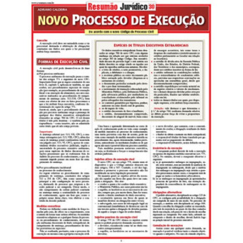 Neste Resumão você encontra os conceitos básicos do Processo de Execução, de acordo com o novo Código de Processo Civil. Conheça as formas de execução civil (as medidas executivas, os sujeitos ativos e passivos da execução cível, a desistência da execução, as obrigações alternativas e a competência), entenda o título executivo (sua natureza jurídica, certeza, liquidez, exigibilidade, cumprimentos provisório e definitivo e a necessidade de garantia na execução provisória) e saiba quais são as características da fraude à execução. Aprenda as principais regras de cada uma das espécies de execução (para entrega de coisa certa, para entrega de coisa incerta, obrigação de fazer e de não fazer e por quantia certa contra devedor solvente), da penhora, do título executivo e da expropriação de bens. E ainda: os conceitos mais importantes dos embargos à execução e um quadro com as espécies de títulos executivos extrajudiciais.
