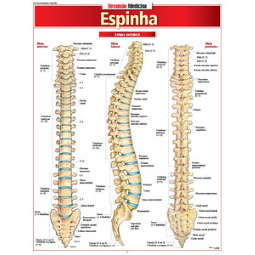 São 25 imagens detalhadas da coluna vertebral. Vistas anterior, lateral e posterior, as vértebras cervicais e lombares, os ligamentos e discos lombares, as articulações e ligamentos, a inserção dos músculos e os músculos cervicais e lombossacrais, o sistema nervoso autônomo e a medula espinhal são alguns pontos abordados.