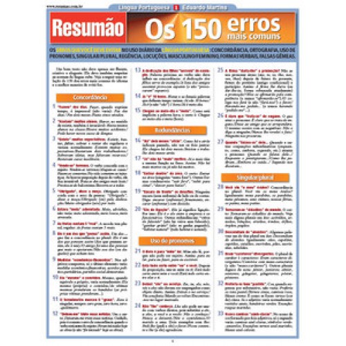O Resumão Os 150 Erros Mais Comuns é um guia prático que enumera os erros que você deve evitar no uso diário da língua portuguesa. Erros de concordância. Redundância. O uso de pronomes. Singular e plural. Os erros mais frequentes de ortografia. Erros de regência e uso incorreto de locuções. Parônimas, as falsas gêmeas. As formas verbais, masculino e feminino. Palavras mal usadas. Destaque para uma lista de 15 erros que você deve evitar a todo custo. Atualizado de acordo com as novas regras de ortografia.