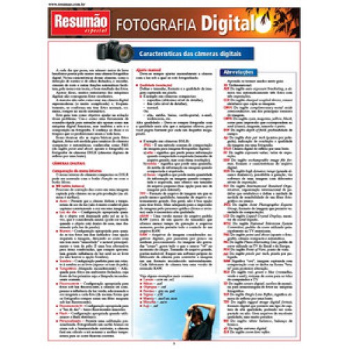 Um guia prático que vai ajudá-lo a entender melhor as câmeras digitais. Dicas e técnicas para aproveitar melhor seu aparelho. Os principais pontos abordados são: características, tipos e funções das câmeras digitais, abreviações, círculo cromático, cartões de memória, estética e composição das fotos. E mais: 10 dicas para fotografar com celulares e iPhones.