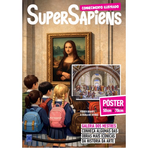 Edição especial em formato pôster da SuperSapiens com a Galeria dos Mestres: a história e informações de algumas das obras mais icônicas da história da arte. De um lado informações e curiosidades, do outra arte ampliada em formato 50 x 70 cm de uma grande obra de arte, para usar na escola, em casa, como decoração ou aprendizado! Nesta edição acompanha arte gigante de "A Escola de Atenas" de Raphael.