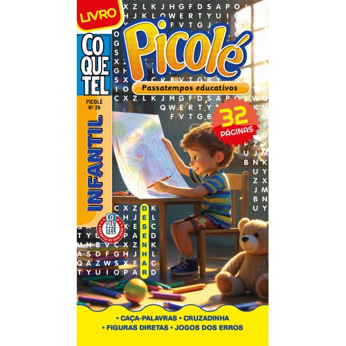 Quer promover momentos de diversão longe das telas para os pequenos? Deixa com a gente!O livro Picolé — Passatempos educativos traz 32 páginas completamente coloridas e repletas de caça-palavras, cruzadinhas, figuras diretas e jogos dos erros, pensados para crianças de 6 a 9 anos:Desenvolvimento cognitivo: atividades que reforçam memória de trabalho, reconhecimento de padrões e interpretação de texto, ampliando o vocabulário sem perceber.
