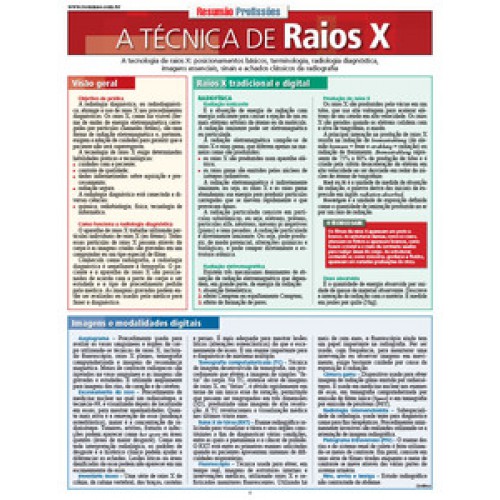 Este Resumão traz os conceitos fundamentais da tecnologia de raios X: visão geral da prática, raios X tradicional e digital, imagens e modalidades digitais, posicionamentos básicos, glossário de terminologia clínica, princípios gerais, procedimentos e radiologia segura nas imagens básicas, sinais e achados clássicos da radiografia. Na última página, um glossário com mais de 40 itens da terminologia radiográfica.