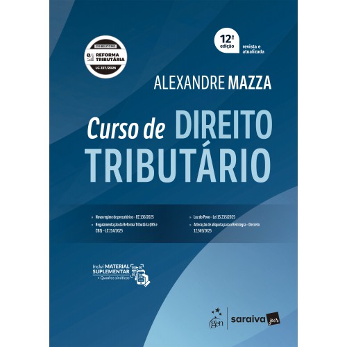 Este Curso de Direito Tributário, do consagrado Professor Alexandre Mazza, ou apenas “Mazza”, como é conhecido pelos alunos, chega a sua nova edição aprimorando as novidades trazidas pela edição anterior. Vale reforçar que o Curso é a evolução natural do até então Manual, que marcou toda uma geração de leitores, ao trazer, a partir de 2015, em formato de livro, a inovação de “conversar” com o estudante sobre o que de fato fosse relevante na disciplina. O Curso herda do seu antecessor a linguagem simples e focada nos pontos mais importantes, com explicações claras, objetivas, cheias de exemplos práticos, e chamando a atenção, sempre que necessário, para as decisões mais importantes dos Tribunais Superiores. A 12ª edição aperfeiçoa as qualidades do livro com o objetivo de ser essencialmente uma obra de formação de estudantes. Conta com mapas mentais estrategicamente elaborados para a fixação das matérias e ao final um índice remissivo completo para uma rápida pesquisa. Além disso, possui acesso online a quadros sinóticos que resumem os assuntos de cada capítulo.