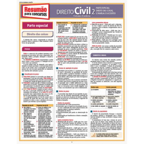 Este Resumão aborda os principais conceitos do Direito Civil (parte especial: direito das coisas e família e sucessões) com foco nos concursos públicos. Confira os temas elencados: direito das coisas: posse e direitos reais, direito de família: casamento, proteção dos filhos e regime de bens, direito das sucessões: sucessão em geral. Ao lado do Resumão para Concursos Direito Civil 1, este título cobre os pontos mais importantes desta área do Direito, que costumam cair nos concursos públicos.
