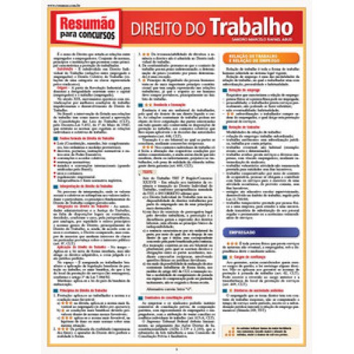 O Resumão aborda os principais conceitos do Direito do Trabalho com foco nos concursos públicos. Relação de trabalho e relação de emprego, empregado, empregador, terceirização, contrato de trabalho, duração do trabalho, férias, remuneração e salário, extinção do contrato, estabilidade, FGTS, trabalho da mulher, trabalho do menor, segurança e saúde, prescrição e decadência, direito coletivo de trabalho e direito de greve são os temas elencados.