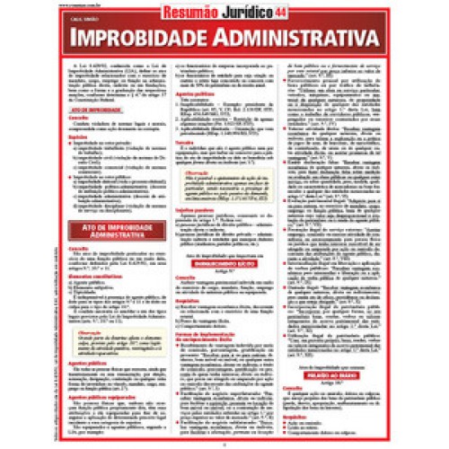 Este Resumão traz as principais informações, os conceitos e as explicações sobre a Lei 8.429/92, a Lei de Improbidade Administrativa. O que é ato de improbidade administrativa e os atos que importam em enriquecimento ilícito, em prejuízo ao erário e que violam os princípios da administração pública. Quais são os excludentes de ilicitude, de culpabilidade e de punibilidade e as formas de investigação. Ação de improbidade administrativa, competência, sentença, sanções e aplicação das penas. Além disso, um fluxograma com o caminho do processo de improbidade administrativa ilustra e facilita a compreensão desta matéria que é objeto de vários concursos públicos.