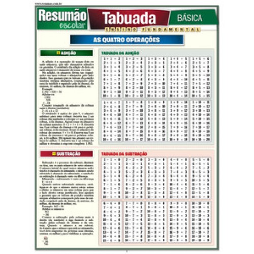 O Resumão Tabuada Básica traz as tabelas com as tabuadas de 1 a 10 nas operações de adição, subtração, divisão e multiplicação. Excelente para consultas rápidas, o Resumão explica cada uma das quatro operações e ajuda a lembrar aquelas contas que sempre fazem a gente perder alguns segundos antes de responder. Ótimo para ajudar as crianças a memorizar as tabuadas antes das provas.