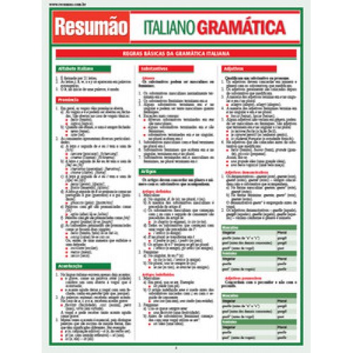 Neste Resumão você encontra as regras básicas da gramática italiana. Alfabeto, pronúncia, acentuação, substantivos, artigos, adjetivos, advérbios, preposições, pronomes, e números. Uma boa parte deste título aborda o uso dos verbos na língua italiana: modos verbais, verbos auxiliares nos tempos compostos e o uso dos modos, tempos e formas verbais.