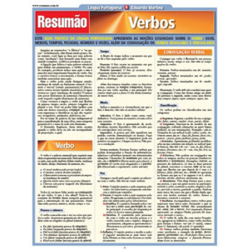Verbo: pessoa, número, tempo, modo, voz. Conjugação verbal: classificação. Verbos regulares: modos indicativo, subjuntivo, imperativo e formas nominais. Verbos auxiliares derivados de ter. Casos especiais: verbos em iar, verbos do MARIO, verbos em ear. Conjugação de verbos irregulares. Uso de modos e tempos – modo indicativo: presente, pretéritos imperfeito, perfeito e mais-que-perfeito, futuros do presente e do pretérito, modo imperativo: afirmativo, negativo, subjuntivo (casos especiais), gerúndio, particípio. Particularidades. Teste. Atualizado com as novas regras de ortografia.