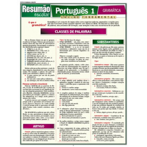 Este guia explica quais são as classes de palavras, suas funções, tipos, as flexões, os graus e o plural. No Português 1, você encontra as principais informações sobre artigo, substantivos, adjetivos e verbos. Além das regras fundamentais sobre cada classe de palavra, notas e observações simplificam o entendimento e o uso correto da nossa língua. O Resumão Escolar Português 2 completa este título na abordagem dos principais pontos da morfologia lecionados no ensino fundamental de português.
