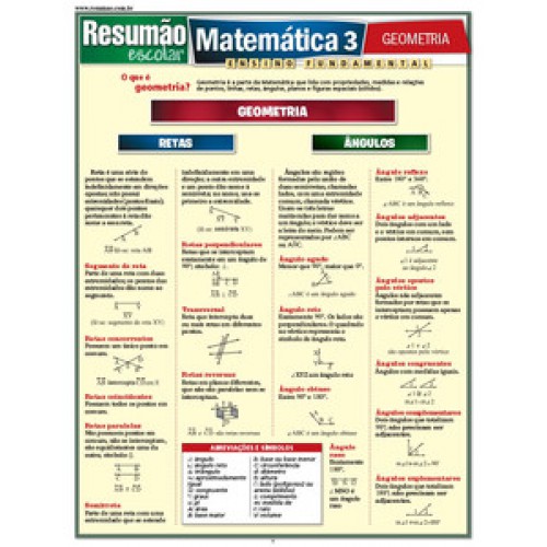 Este Resumão traz os conceitos básicos da geometria: retas, ângulos, polígonos, triângulos, quadriláteros, círculos, elipses e sólidos (poliedros, prismas, pirâmides e sólidos com superfícies curvas). Você encontra ainda as definições e os tipos de retas, ângulos e polígonos, além da classificação dos triângulos e dos quadriláteros (paralelogramo, retângulo, losango, quadrado e trapézio), entre outros.