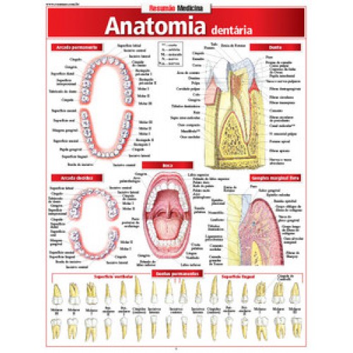 Cerca de 30 imagens detalhadas das partes do corpo humano relacionadas com a odontologia, com dezenas de identificações anatômicas. A boca. As arcadas permanente e decídua. Os dentes permanentes mostrados isoladamente. Gengiva marginal livre. O dente. Os músculos e ossos da cabeça. Os linfonodos da cabeça e do pescoço. As cavidades oral e nasal. O septo nasal e os seios paranasais. Anatomia de superfície da cabeça, da boca e do nariz. Os nervos trigêmeos. Pré-erupção dos dentes. A boca e as glândulas salivares. O crânio e suas artérias.