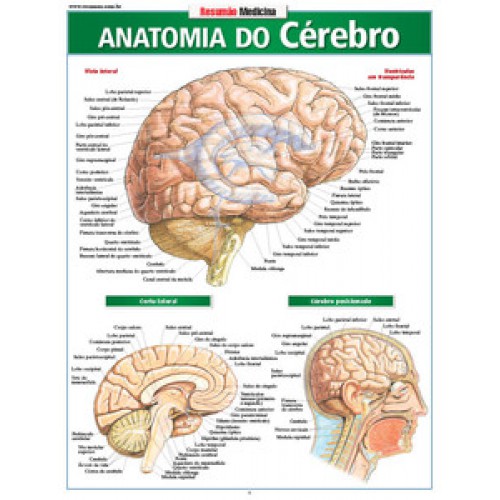Os detalhes do cérebro em vinte lindas e detalhadas ilustrações, com mais de 400 identificações anatômicas. Vista lateral do cérebro, ventrículos em transparência, corte lateral, cérebro posicionado, vista anterior, corte frontal, vista inferior, corte horizontal, artérias inferiores, tronco encefálico e glândula pineal, esquema do sistema circulatório, círculo de Willis, meninges, glândula hipófise, hipotálamo, vistas frontal e posterior internas do crânio, bulbo olfatório e epitélio.