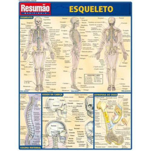 Duas dezenas de ilustrações do esqueleto, com indicações anatômicas, que facilitam a identificação dos ossos. Vistas anterior, lateral e posterior do esqueleto. A coluna vertebral. Os ossos da cabeça. A estrutura óssea. A escápula. Vistas frontal e posterior do cotovelo. Os ossos do quadril. Os ossos da mão. Os ossos do joelho. Os ossos do pé.