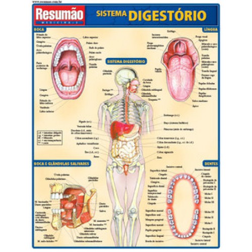 Onze ilustrações mostram o sistema digestório em detalhes, com dezenas de identificações anatômicas. O sistema digestório. A boca. A boca e as glândulas salivares. Os dentes. Os ductos biliares e pancreáticos. O estômago. O intestino delgado e o intestino grosso. O esfíncter ileocecal e o apêndice. O reto.