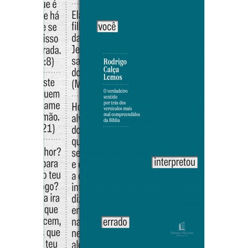 Rodrigo Calça Lemos já esteve na posição de não conseguir interpretar bem as Escrituras. Agora teólogo, ele usa este livro para revelar o sentido real de 49 versículos que, ao longo do tempo, foram tirados do seu contexto original. Organizado por gêneros literários bíblicos e enriquecido com apêndices de princípios de exegese e indicações de livros, Você interpretou errado é um guia inicial para quem deseja ler a Bíblia com fidelidade ao contexto.