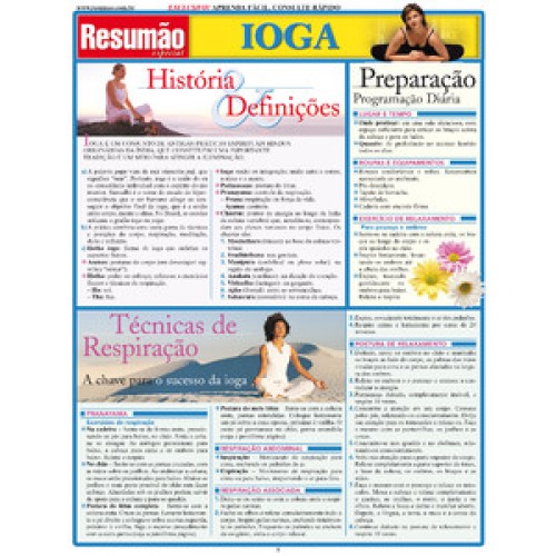 O que é ioga: história e definições. Preparação: programação diária, lugar e tempo, roupas e equipamentos, exercício de relaxamento. Técnicas de respiração: pranayama, respiração abdominal, respiração associada e postura de relaxamento. Posturas de aquecimento: giro do pescoço, da borboleta, do gato e do cachorro. Posturas em pé: da montanha, da árvore, da águia, do guerreiro e inclinada em pé. Posturas no chão: do bebê, de anteflexão, do ângulo aberto, do lótus, do meio lótus, cabeça em direção ao joelho, da cobra, do arco, da ponte. Saudação ao sol.
