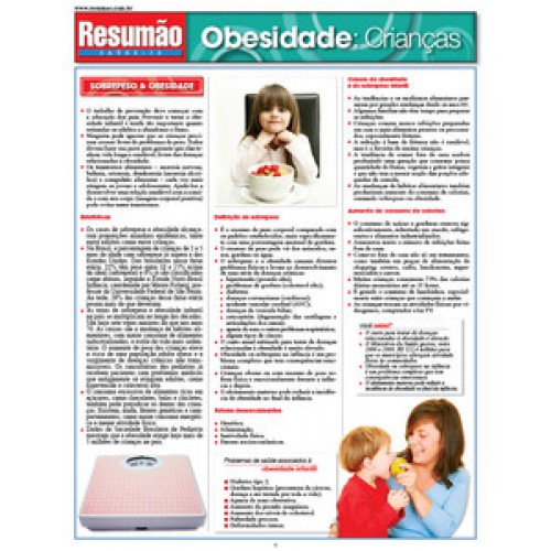 Um guia de saúde sobre um dos grandes problemas da atualidade. A diferença entre sobrepeso e obesidade, as causas da obesidade e do sobrepeso infantil. A avaliação de uma criança com sobrepeso (orientações para profissionais de saúde). Metas para o controle do peso, necessidades alimentares das crianças. Dicas para comer fora de casa. Informação nutricional nos rótulos dos alimentos e dicas para os pais.