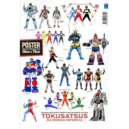 A cultura pop japonesa marcou gerações com suas séries de heróis em armaduras metálicas, robôs gigantes e equipes coloridas que protegiam a Terra de ameaças diversas. “Tokusatsus da Nossa Infância” reúne os personagens mais emblemáticos que povoaram a memória de quem cresceu entre os anos 1980 e 1990. A publicação apresenta uma arte comemorativa em pôster de 50cm x 70cm com figuras que remetem às produções televisivas exibidas no Brasil, com destaque para séries como Jaspion, Changeman, Jiban, Flashman, Spielvan, Winspector e outros representantes clássicos do gênero.