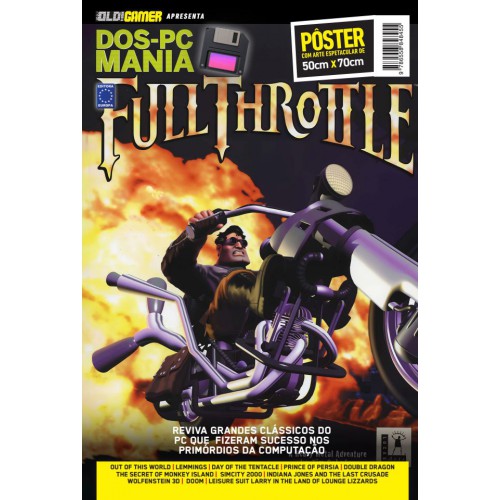 A edição especial "Full Throttle - DOS-PC Mania", da série Old!Gamer, destaca um dos jogos mais icônicos da era DOS com um atrativo exclusivo: um pôster em tamanho 50 cm x 70 cm com arte original do clássico da LucasArts. Mais do que uma revista, esta publicação se transforma em item de coleção, unindo conteúdo histórico com um material gráfico que pode ser exibido como peça de decoração. O pôster estampa o protagonista Ben em sua moto, em uma cena que remete diretamente ao espírito rebelde e à estética das aventuras gráficas dos anos 90.