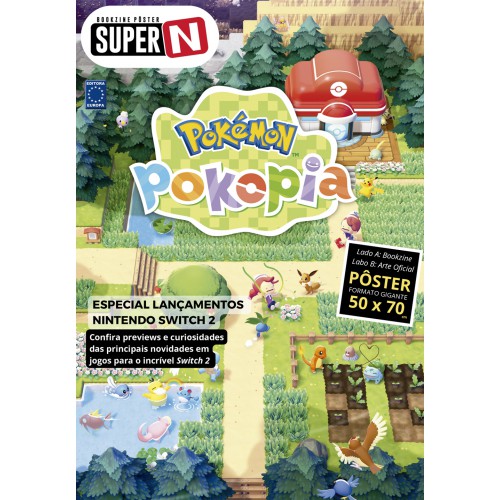 Edição especial da SuperN no formato bookzine poster. No lado livro curiosidade e informações sobre os novos jogos que estão chegando para o Nintendo Switch 2. Do outro um poster com arte oficial de divilugação de um jogo famoso. Nesta edição o poster em formato 50x70cm traz Pokémon Pokopia!