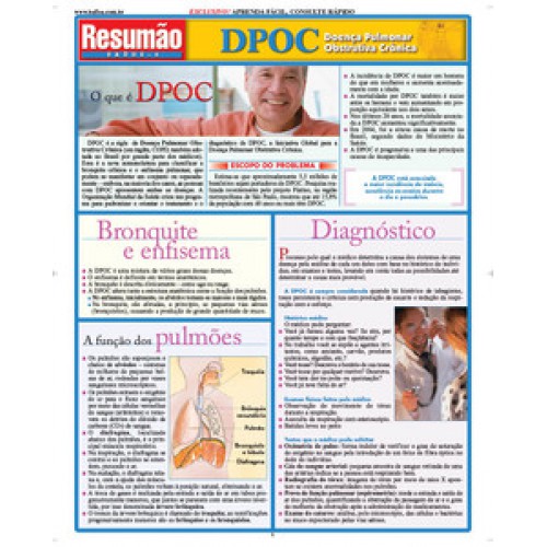 Informações essenciais para as pessoas que têm bronquite crônica e enfisema pulmonar. O que é Doença Pulmonar Obstrutiva Crônica (DPOC). Bronquite e enfisema. A função dos pulmões. Diagnóstico da doença. Sintomas. Como administrar a DPOC. Mais informações sobre a bronquite crônica e o enfisema pulmonar. Tratamento da DPOC. Nutrição. Cirurgia. Terapia de oxigênio domiciliar. Descanso. Exercícios. Dicas para viagens aéreas. Fontes de informação.